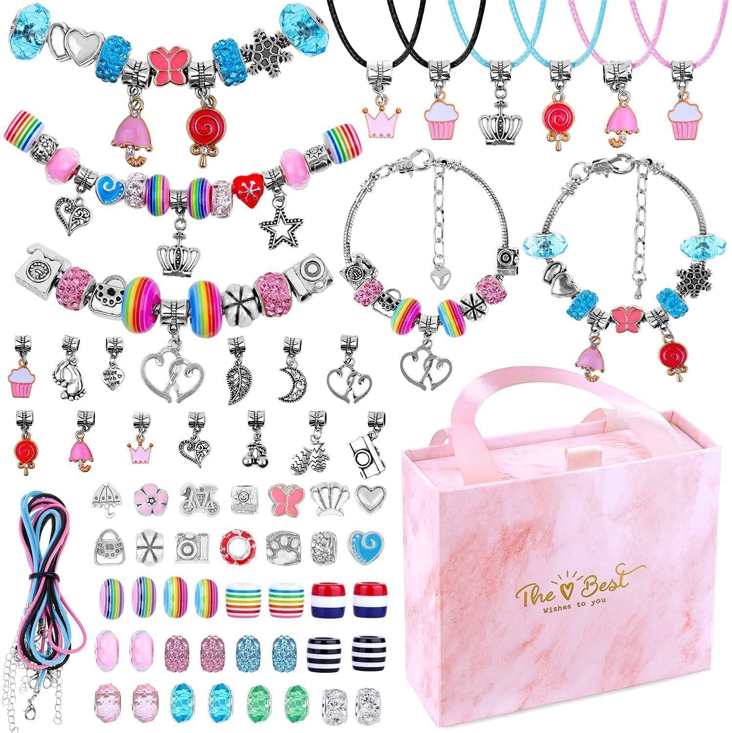 ⭐Kit de Création de Bracelets DIY—Notre kit de création de bracelets DIY comprend une belle boîte cadeau avec 20 perles charmantes, 20 perles colorées, 20 pendentifs et 3 chaînes de bracelets en argent, pour vous amuser à créer vos propres bijoux uniques.